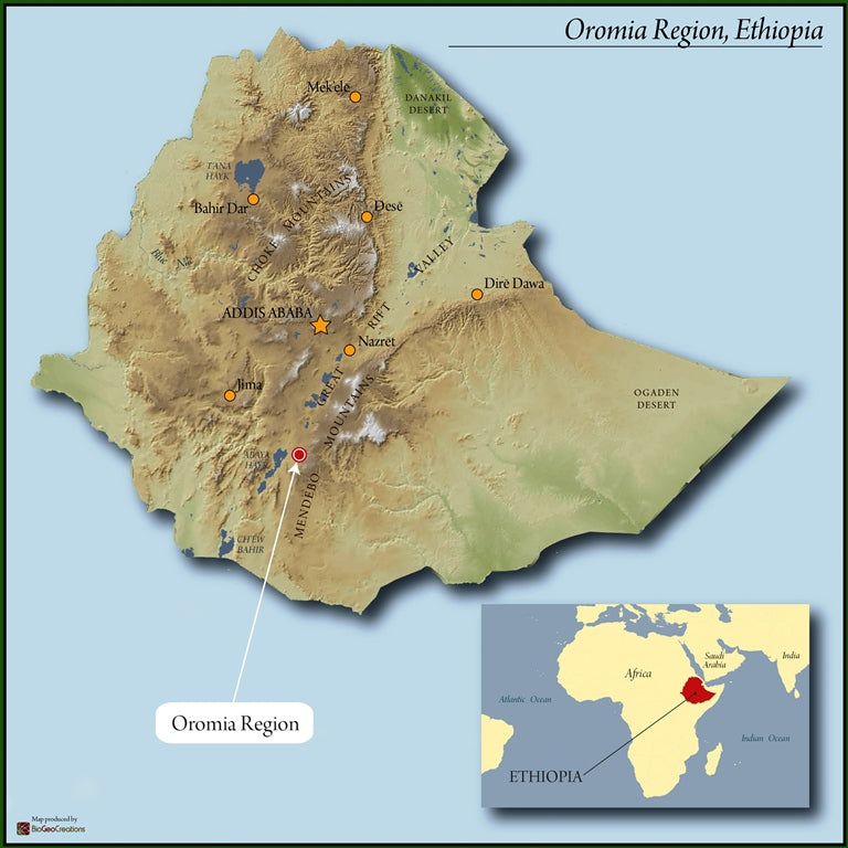 The Oromia Regional State in Ethiopia, the country's largest region, is home to more than 35 million people and spans over 110,000 square miles. It is a region rich in coffee-growing territories, with 65% of Ethiopia's coffee cultivation happening here in the noteworthy coffee regions of Jimma, Illubabor, Harar, Arsi, and the Guji Zone. The Oromia have consolidated resources and enhanced their position in the global coffee market by forming the Oromia Coffee Farmers Cooperative Union, (OCFCU), to ensure that premiums from coffee exports directly benefit farmers, fund organic farming initiatives, provide equipment for processing mills, and support food security programs. Additionally, OCFCU prioritizes quality control through its central cupping lab, and promotes sustainability through organic certification. They also offer financial services like pre-harvest financing and crop insurance through the Cooperative Bank of Oromia for rural farmers who historically lacked access to such resources.
